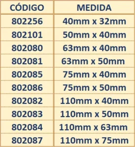 110mm x 40mm, 110mm x 50mm, 110mm x 63mm, 110mm x 75mm, 40mm x 32mm, 50mm x 40mm, 63mm x 40mm, 63mm x 50mm, 75mm x 40mm, 75mm x 50mm