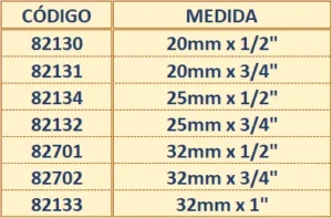 | ELEGIR MEDIDA: | 20mm x 1/2", 20mm x 3/4", 25mm x 1/2", 25mm x 3/4", 32mm x 1", 32mm x 1/2", 32mm x 3/4" |