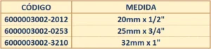 20mm x 1/2", 25mm x 3/4", 32mm x 1"